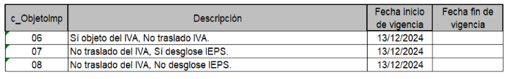 La actualización se llevó acabo únicamente en el catálogo c_ObjetoImp, que contiene el catálogo de conceptos que son objeto de impuesto.