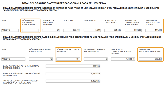 Tomaremos como ejemplo el cálculo de impuestos del mes de agosto de 2024. En esta primera imagen revisaremos los datos del pago provisional y definitivo de IVA: