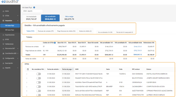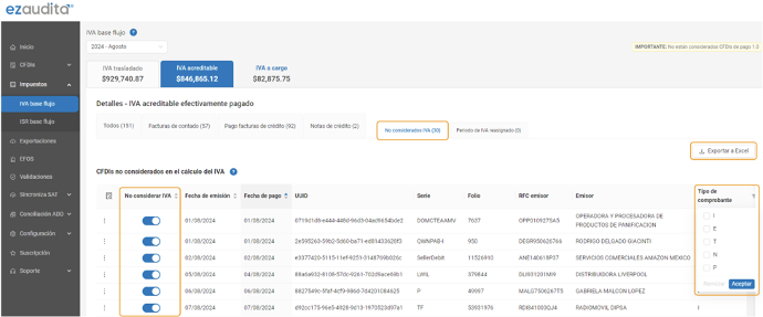 precargados de impuestos del SAT con ezaudita® detectando detalladamente los CFDIs incluidos y excluidos en el cálculo de IVA por parte del SAT.