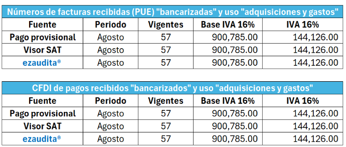Para el cálculo de IVA acreditable en ezaudita® utilizamos el mismo algoritmo y consideraciones que el SAT para que concilie automáticamente con los visores y precargado de IVA del SAT. Sin embargo, esto no significa que el cálculo de IVA del SAT sea el correcto, ya que pueden existir facturas o CFDI de pagos recibidos “no bancarizados” o facturas con uso de CFDI diferente a “adquisiciones y gastos” que si se deben de considerarse en el cálculo de IVA acreditable, por eso la importancia de detectar exactamente cuáles son los CFDIs que se están excluyendo en el cálculo de IVA para poder corregir los importes en los pagos provisionales precargados teniendo la certeza que nosotros estamos bien en caso de algún requerimiento por parte de la autoridad.