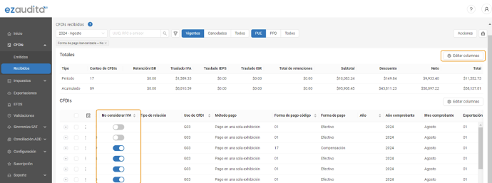 Dentro de las vistas detalladas de ezaudita® también encontrarás la opción para agregar la columna “no considerar IVA” para que desde aquí puedas elegir si quieres que un CFDI se considere o no en el cálculo de IVA como lo muestra la siguiente imagen: