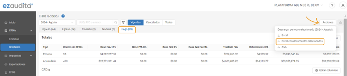 ezaudita®, al sincronizar diariamente tanto los CFDIs como el metadata del SAT permite obtener los mismos cálculos de IVA del SAT con la facilidad de poder mostrar el detalle de las facturas PUE y CFDIs de pagos del periodo que estamos revisando.