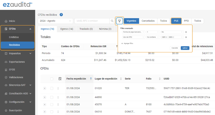 Otra forma de filtrar en ezaudita® para detectar los CFDIs que excluyó el SAT es entrando en la vista de los CFDIs recibidos, elegir que muestre solamente las factura PUE y en los filtros avanzados puedes elegir que muestre solamente los que tienen forma de pago “no bancarizados” o aquellos cuyo uso de CFDI sea diferente a “G01-Adquisiciones” o “G03-Gastos generales”: