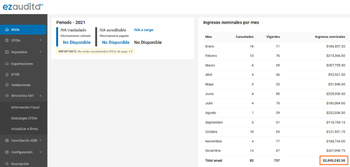 Te recomendamos utilizar ezaudita® que permiten obtener los detalles de los CFDIs emitidos y recibidos que tiene el SAT de tu empresa, para llevar mejor control de los ingresos nominales, además genera el cálculo de IVA de manera automática con el mismo algoritmo del SAT permitiendo conocer el detalle de cuáles son exactamente los CFDIs que incluyó el SAT en sus visores y en el precargado de pagos provisionales, así como los que excluyó en el cálculo del IVA acreditable.