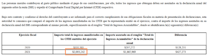 B. El FECHA DE CARTA INVITACION, mi representada recibió por correo electrónico el oficio de vigilancia profunda con número de Folio NO FOLIO, correspondiente a los ejercicios 2020 y 2021, sobre los ingresos manifestados en la declaración anual de esos años. A continuación, adjunto la captura de pantalla de las supuestas diferencias plasmadas en el comunicado para mayor referencia: