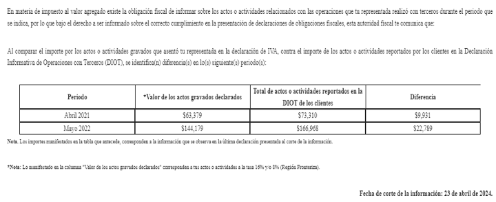 B. Con fecha 09 de mayo de 2024, mi representada recibió por correo electrónico el comunicado por concepto de vigilancia profunda con número de folio número de folio, mediante la cual se le invita a aclarar o corregir supuestas diferencias entre el importe del valor de los actos gravados declarados y el total de los actos o actividades reportados en la Declaración Informativa de Operaciones con Terceros (DIOT) de los clientes en los periodos periodos observados de mi representada. Para mejor referencia a continuación se comparte la captura de pantalla de las supuestas diferencias plasmadas en el comunicado: