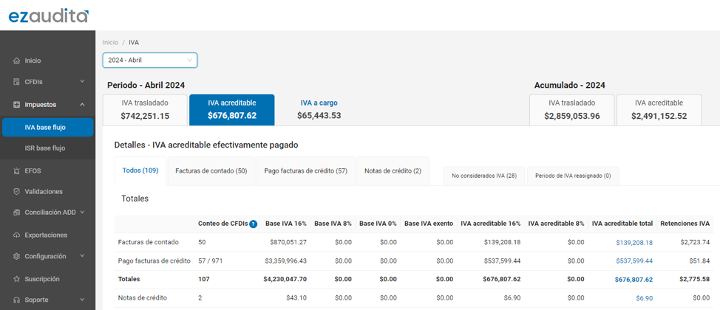 Recuerda que ezaudita® te permite obtener el detalle del cálculo de IVA trasladado y acreditable por tipo de comprobante, ya sean facturas de contado con método de pago PUE (pago en una sola exhibición) y CFDIs de pagos considerando la fecha de pago como lo genera el SAT: